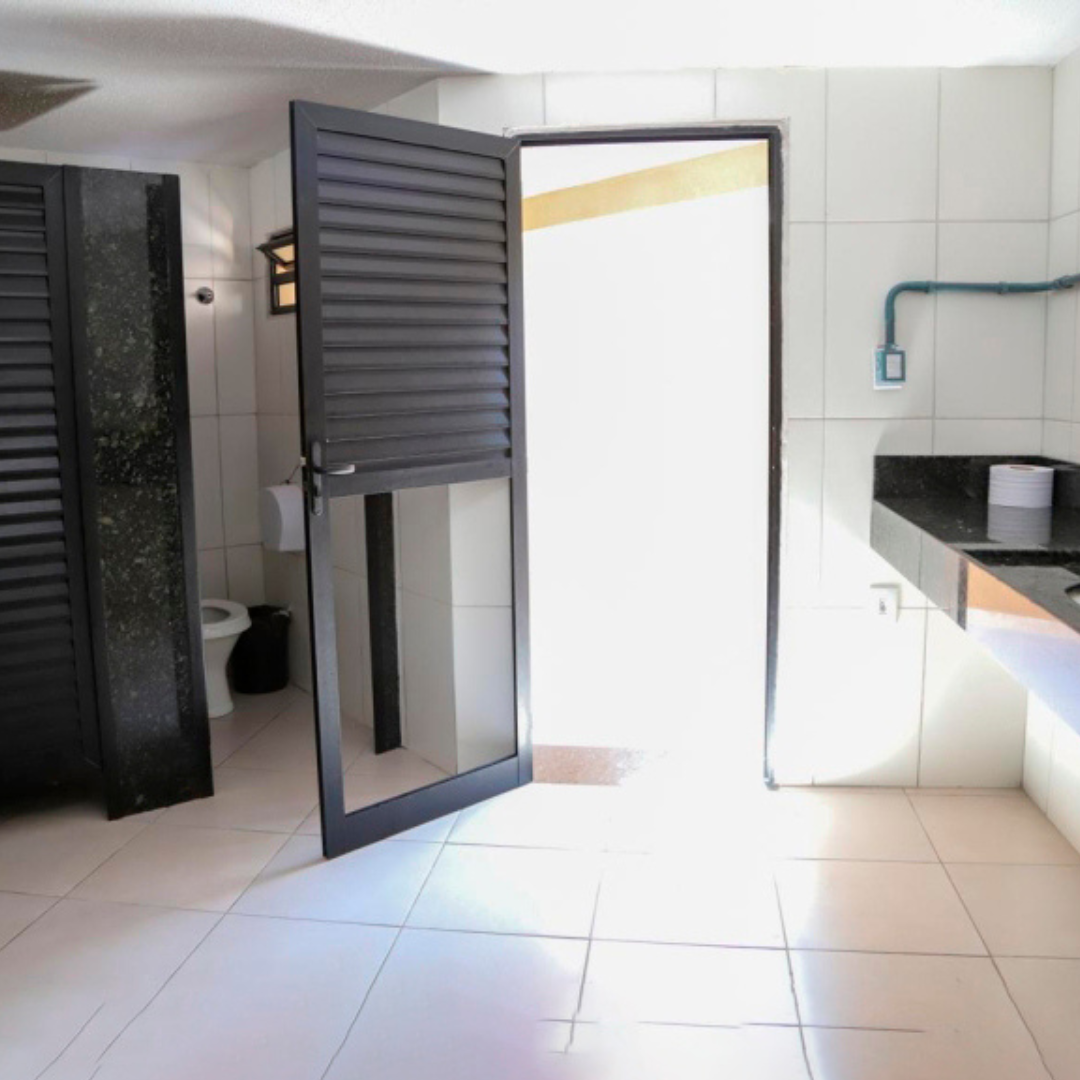 No banheiro feminino, foram registrados diversos estragos: a parte inferior da porta de entrada foi arrancada; o suporte de papel higiênico e a saboneteira foram quebrados e amarrados de forma improvisada; a válvula de descarga sofreu danos internos e teve seu acabamento removido; além da retirada de uma luminária do teto. Já no banheiro masculino, houve a retirada da mangueira do mictório e do acabamento do registro, além da quebra da tampa do vaso sanitário, prejudicando seu uso adequado.