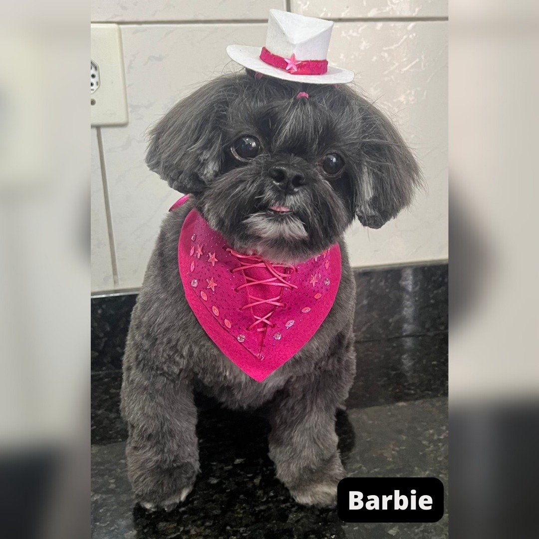 A nossa pequena blogueirinha também ama andar estilosa. Roupinhas ela não gosta muito, mas adora lacinhos. Então, toda vez que a Nina sai do banho e tosa, montamos um look com o tema do momento. Como neste mês é a estreia do filme da Barbie, vestimos ela com um chapeuzinho e uma bandana rosa igual ao do filme.