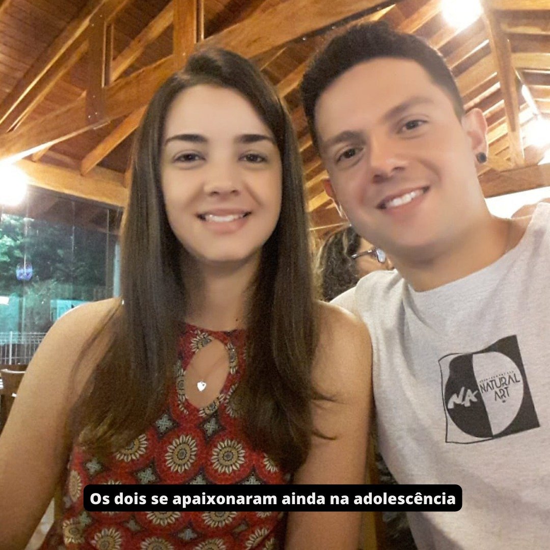 Na adolescência, estudamos juntos na mesma escola, frequentamos a mesma igreja e também participávamos das mesmas festinhas. Em todos esses encontros, começamos a notar um olhar mais apaixonado entre os dois, um olhar não mais de amigos. Aos 14 anos, rolou o nosso primeiro beijo. Na época, até viajamos juntos para a praia com a família dele e passamos o fim de semana todo juntinhos.