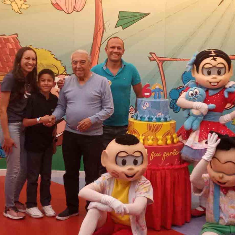 Pedro Ribas ao lado dos pais Simone e Cláudio, do ídolo Mauricio de Sousa e da Turma da Mônica.