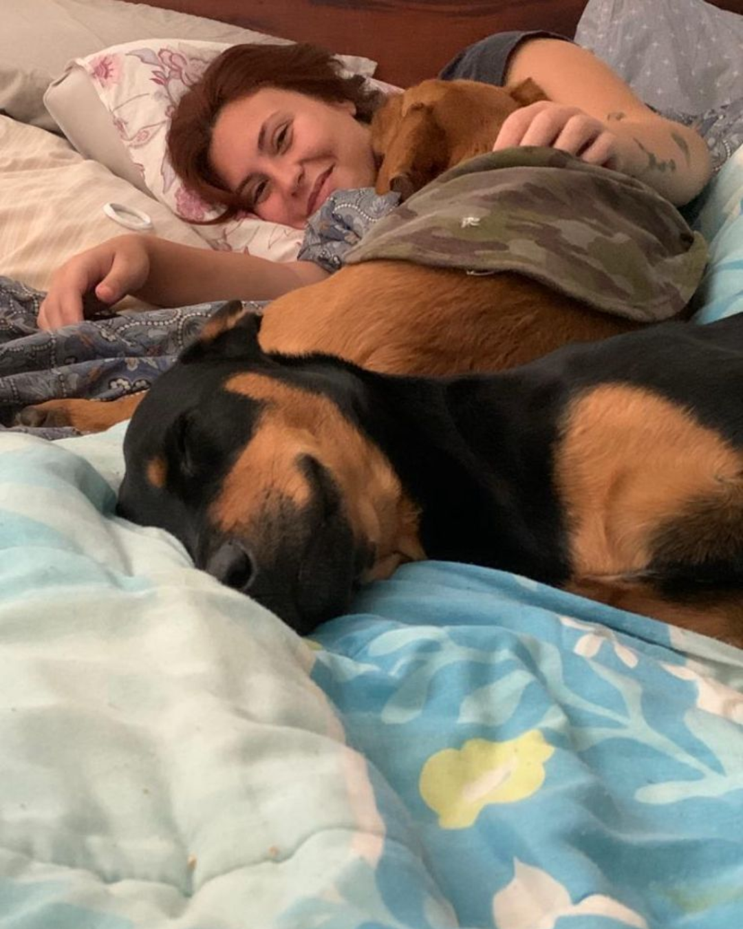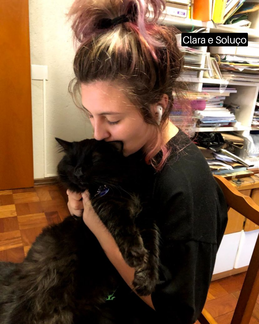 Adotei as cachorras pela ONG Pata Sem Dono e o gato veio da rua mesmo. A Maria Eugênia foi adotada em janeiro de 2020. Ela é dona das caras mais engraçadas, ama dormir de conchinha, principalmente na rede e é muito inteligente. Ela consegue abrir portas e janelas pra fugir de casa. A Pérola foi adotada em dezembro de 2019, é super carinhosa e protetora. Já o Soluço foi adotado em janeiro de 2019. Ele virou um gato gordo, gigante e imenso que deixa a gente fazer tudo que quiser com ele. Costumo brincar que ele nem parece gato.