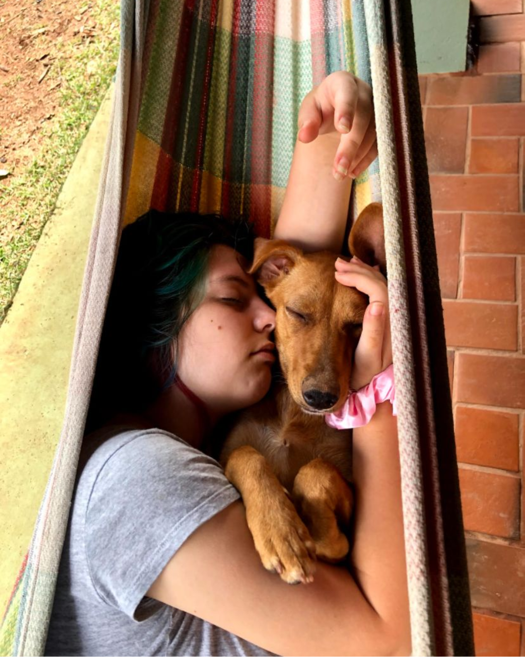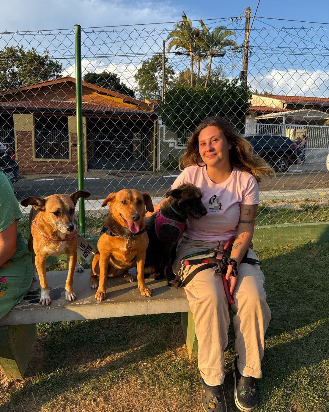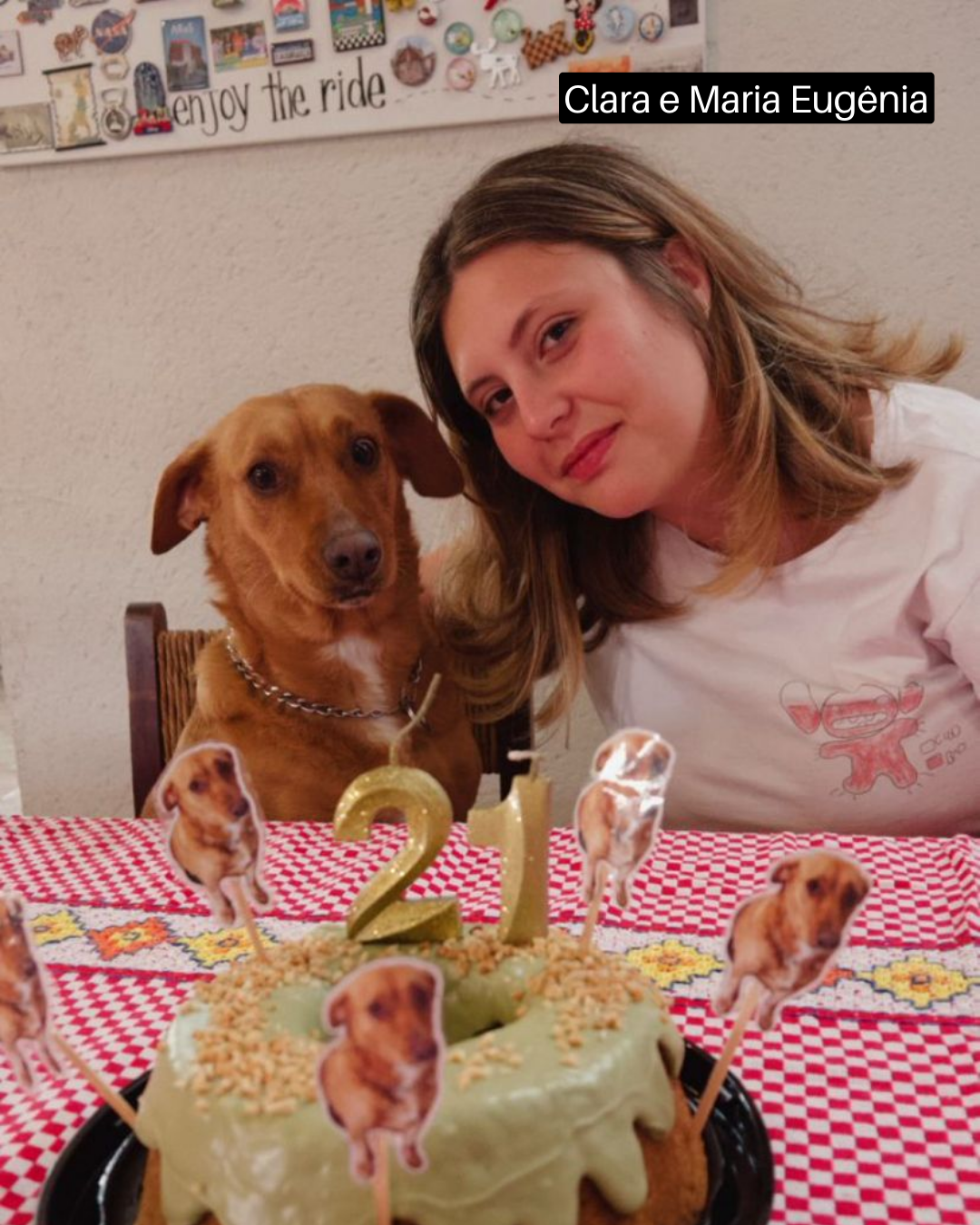 Desde pequena, sempre fui apaixonada por animais, tanto que hoje estudo Medicina Veterinária e dedico grande parte da minha vida ao cuidado com eles. Tive a sorte de crescer ao lado de cachorras que foram minhas companheiras por muitos anos, e quando elas se foram, percebi que o vazio era grande demais para ser ignorado. Foi então que adotei o Soluço e a Pérola, e conheci a Maria Eugênia, uma cadelinha adulta que vi pela internet. Foi a primeira vez que adotei um animal adulto. Algo nela me tocou profundamente, senti que era ela. Foi amor à primeira vista.
